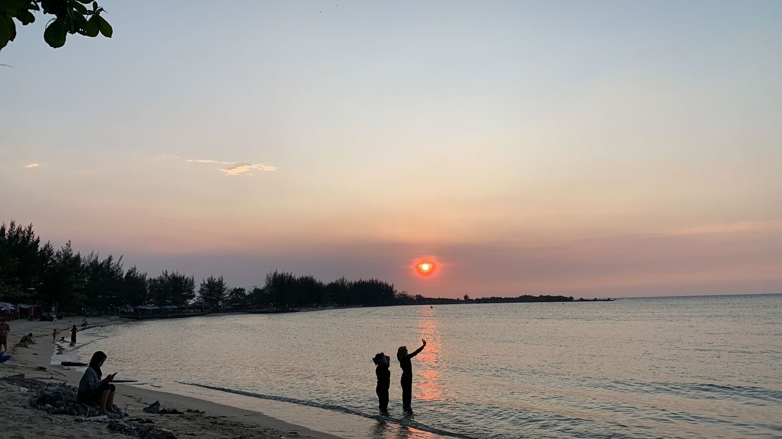 Guratan cahaya matahari berwarna merah kekuningan, berpadu dengan birunya langit dan lautan menambah sempurna keindahan alam pantai itu. Itu menjadi pemandangan indah yang tidak bisa dilewatkan bagi para pecandu senja. Pantai dengan pasir putih dan berombak tenang cocok untuk destinasi piknik keluarga. Kebersihan di sekitarnya juga cukup terjaga.