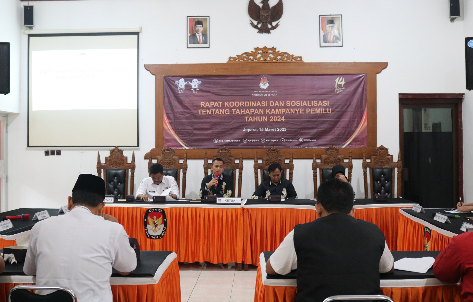 Hal ini membuat Komisi Pemilihan Umum (KPU) Kabupaten Jepara menggelar rapat koordinasi (rakor) dan sosialisasi bersama pimpinan parpol peserta pemilu 2024 terkait ketentuan yang mengatur pelaksanaan kampanye pemilu.