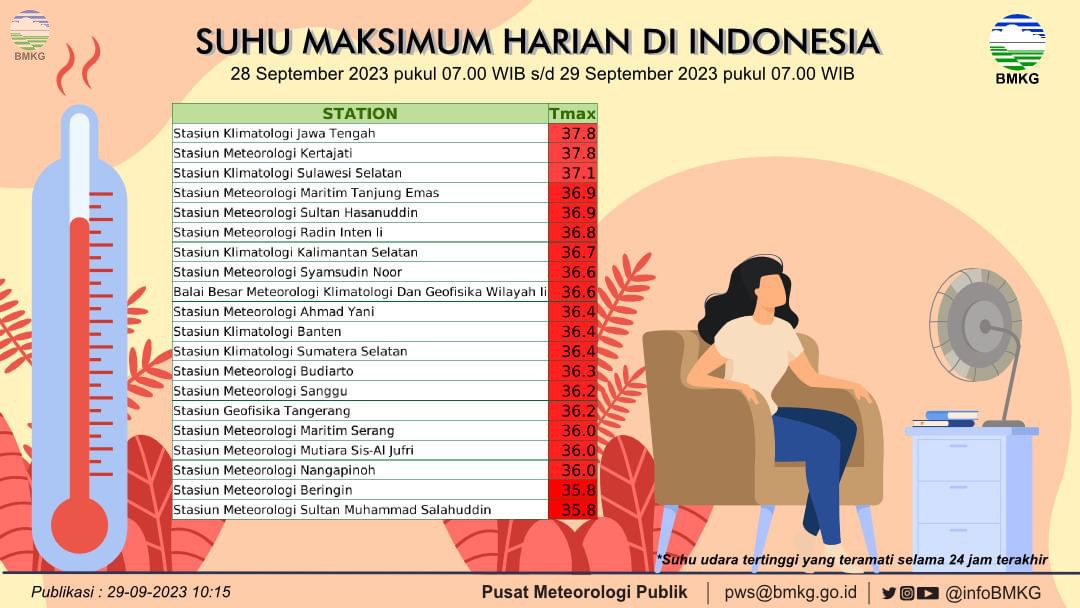 Guswanto menjelaskan, berdasarkan data hasil pengamatan BMKG, suhu maksimum terukur selama periode tanggal 22 – 29 September 2023 di beberapa wilayah Indonesia terjadi cukup tinggi dengan kisaran suhu antara 35 – 38.0 °C pada siang hari, dimana suhu maksimum tertinggi selama periode tersebut ada yang mencapai hingga 38.0 °C yang terukur di Kantor Stasiun Klimatologi Semarang – Jawa Tengah pada tanggal 25 dan 29 September 2023.