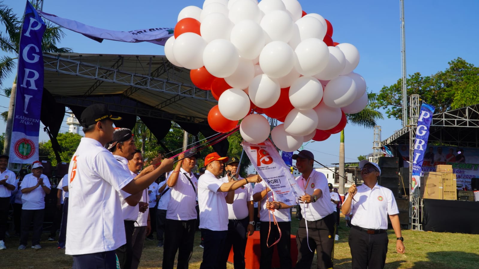JEPARA | GISTARA.COM Pj. Bupati Jepara Edy Supriyanta, memimpin apel dan Jalan Sehat dalam rangka peringatan Hari Ulang Tahun (HUT) Persatuan Guru Republik Indonesia (PGRI) yang ke-78, dan Hari Guru Nasional (HGN) Tahun 2023 di Alun-alun Kabupaten Jepara, Sabtu (14/10/2023).