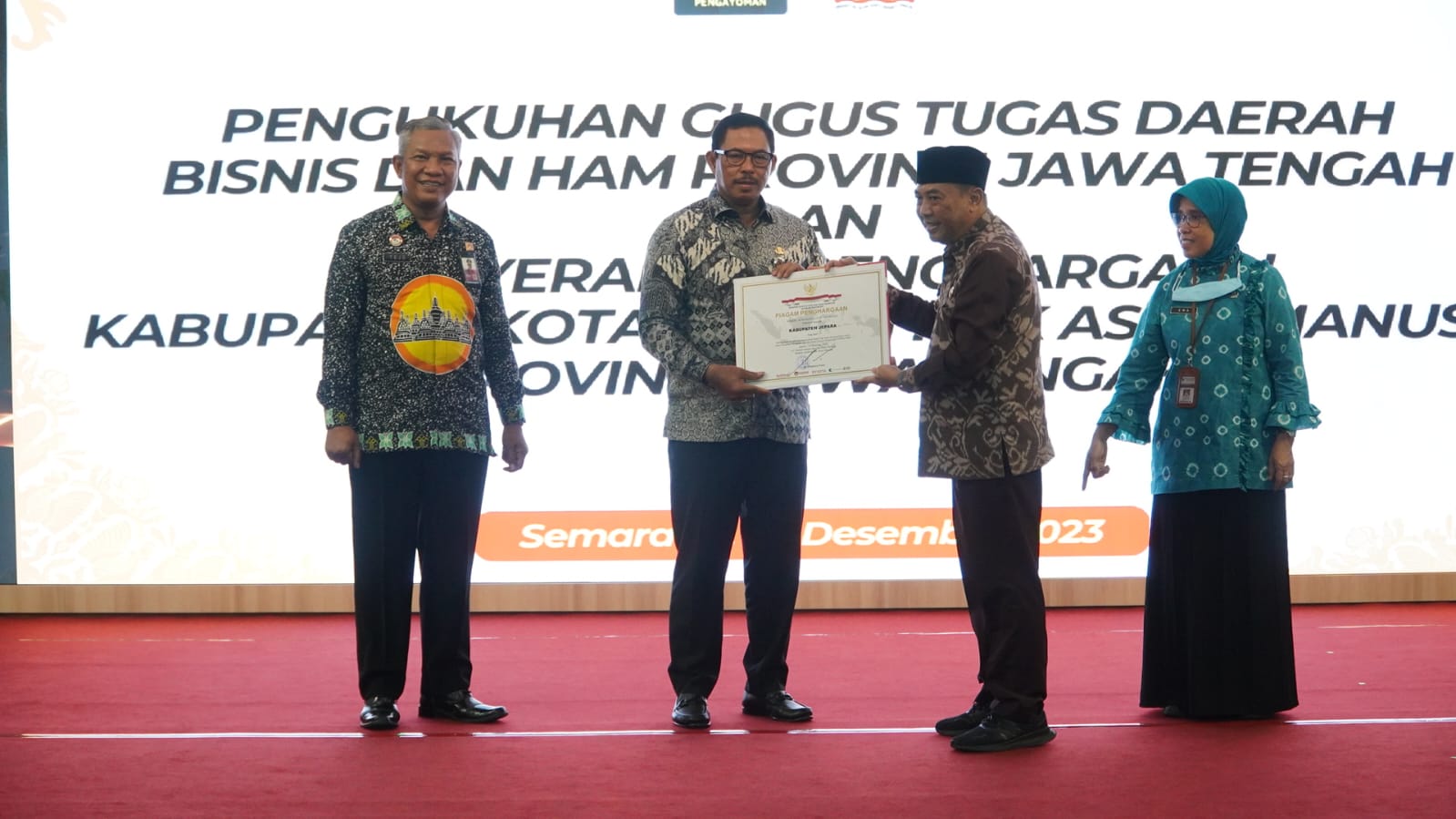 Dari beberapa indikator itu, Kabupaten Jepara mendapat nilai 90,9 poin. Penyerahan penghargaan tersebut, juga terangkai dengan pengukuhan Gugus Tugas Daerah Bisnis dan HAM Provinsi Jawa Tengah.