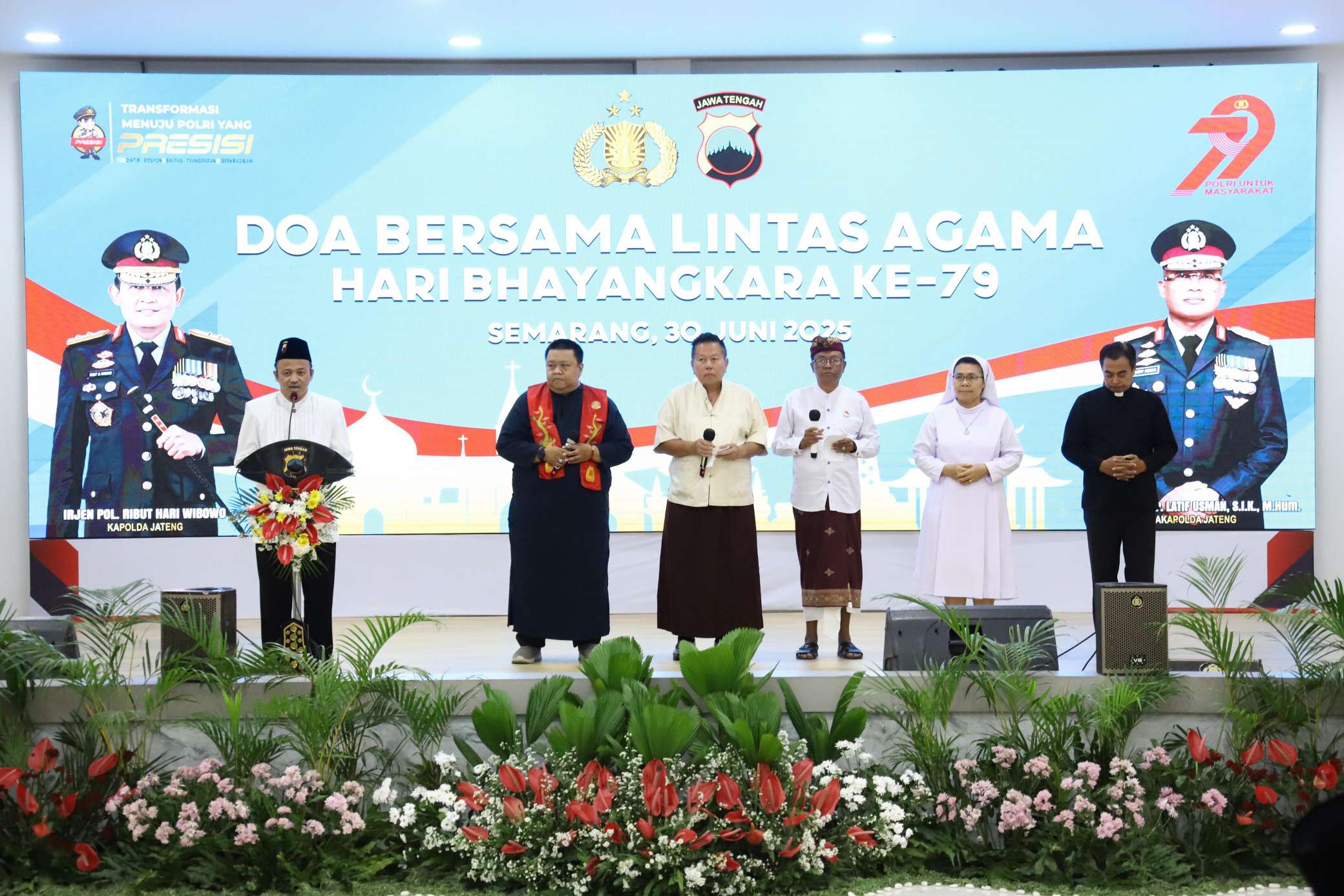 SEMARANG | GISTARA. COM – Dalam rangka memperingati Hari Bhayangkara ke-79, Polda Jateng menggelar kegiatan Doa Bersama Lintas Agama yang berlangsung khidmat dan penuh semangat kebersamaan pada hari Senin, (30/6/2025) pagi di Gedung Borobudur Mapolda Jateng. Kegiatan ini menjadi momen reflektif sekaligus simbol harmoni antar umat beragama dalam mendukung peran Polri sebagai pelindung, pengayom, dan pelayan masyarakat.