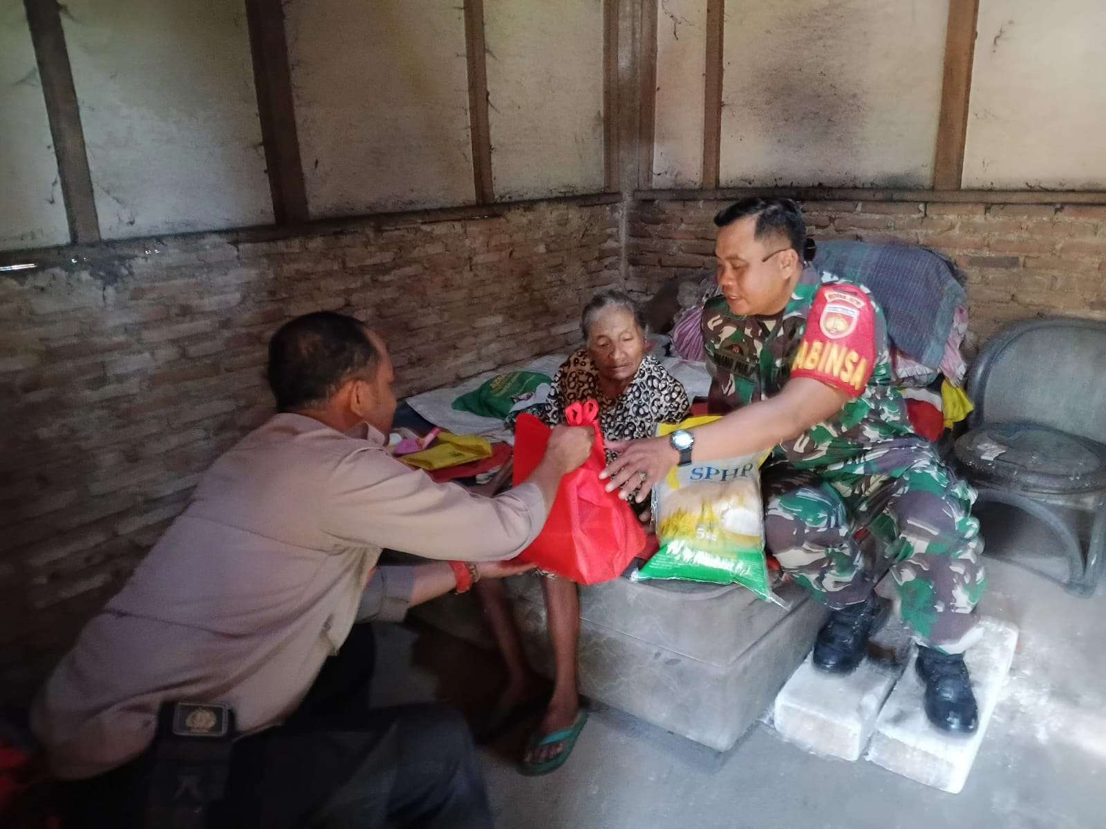 Bripka Budi tidak hanya menyerahkan bantuan sembako, tetapi juga menyampaikan pesan-pesan kamtibmas.