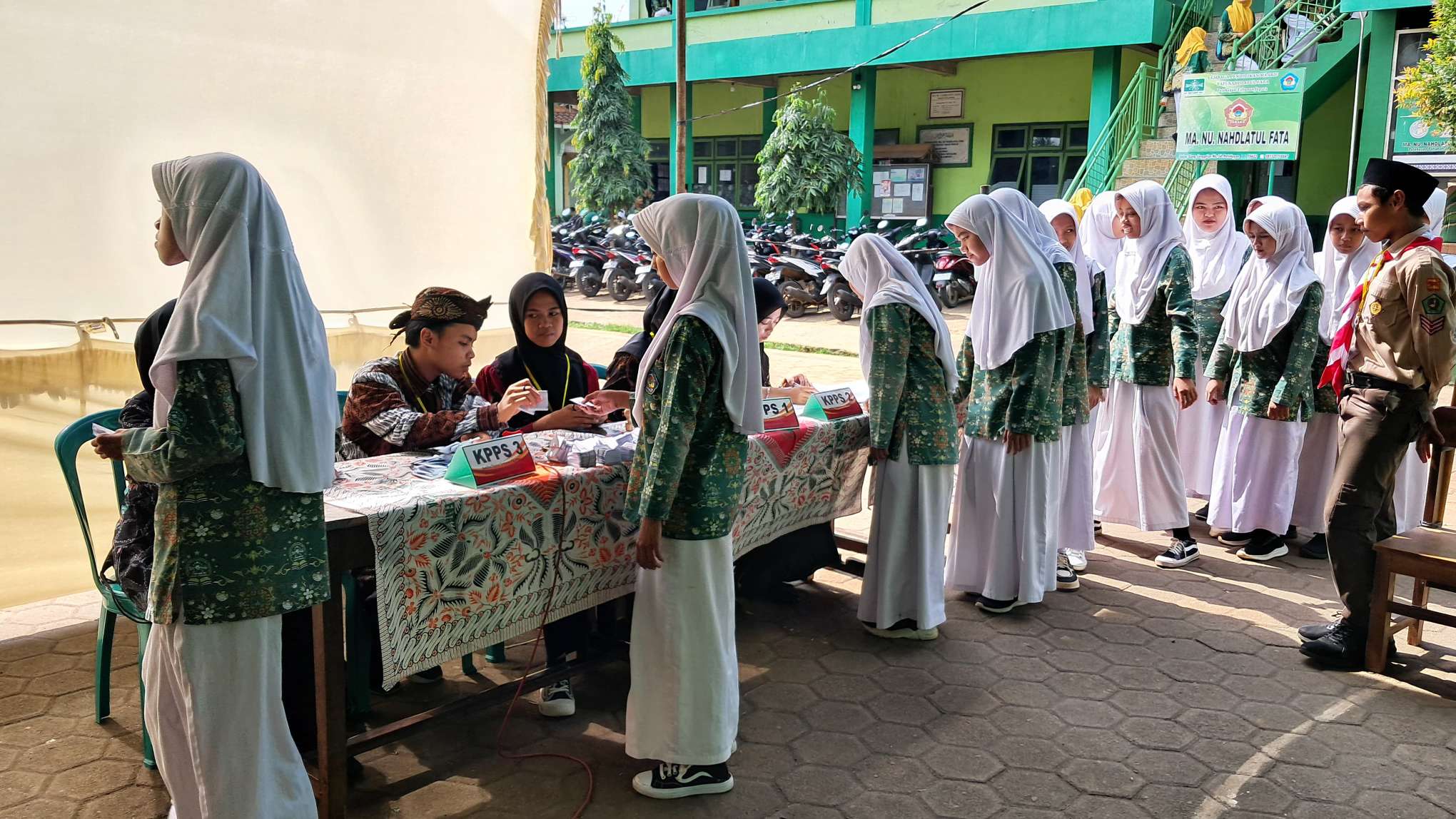 Para siswi antri, bersiap untuk melakukan pemungutan suara