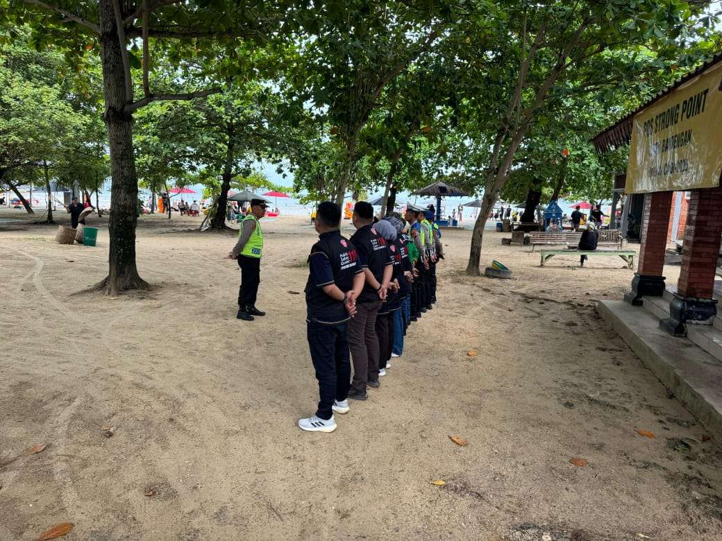 Terlihat personel Ops Lilin Candi Polres Jepara melaksanakan pengamanan di Obyek Wisata Pantai Kartini dan Pantai Bandengan Jepara, pada Sabtu (27/12/2025).