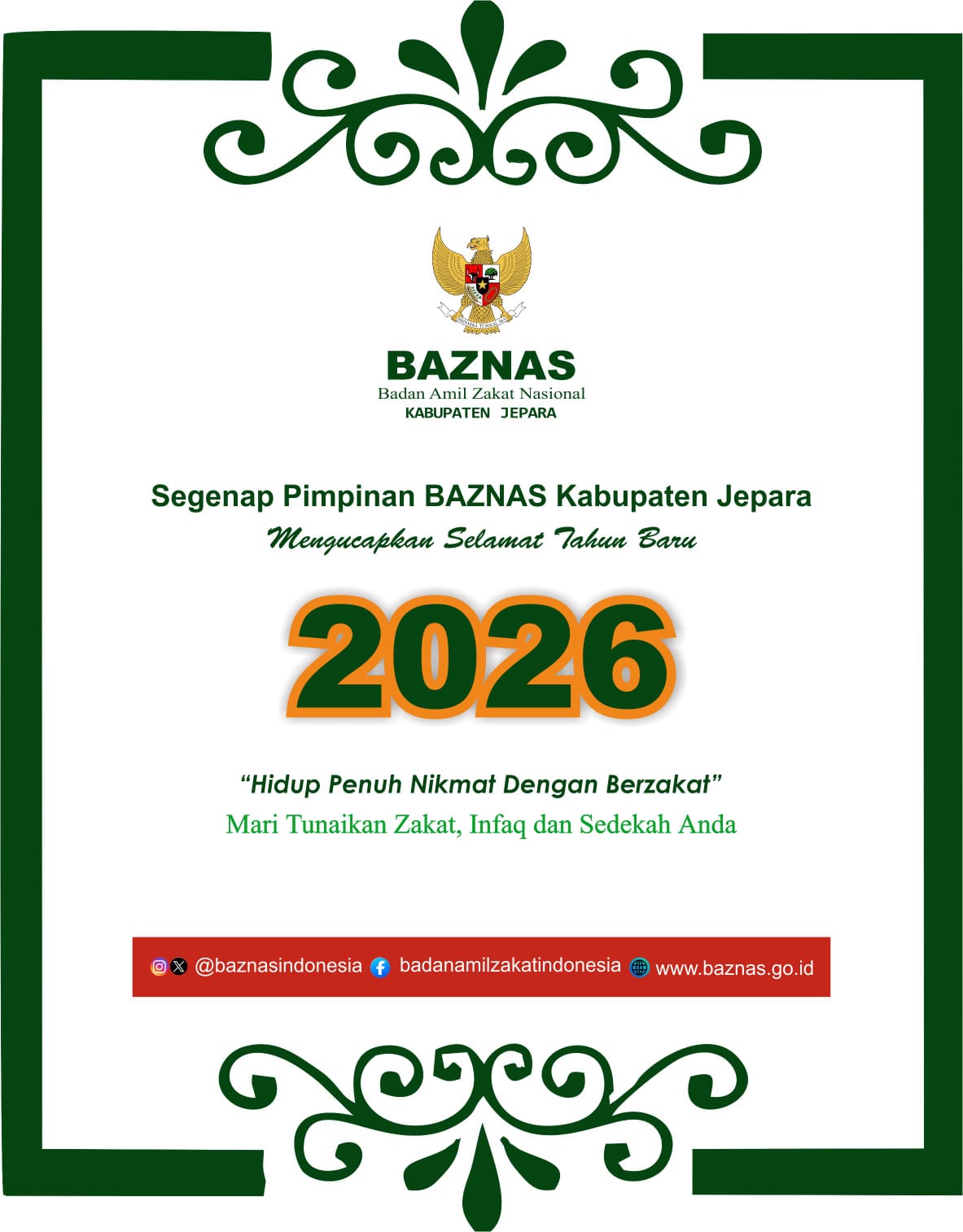 MuriaBAZNAS Jepara Mengucapkan Selamat Tahun Baru 2026 by Redaksi 31/12/2025 Redaksi 31/12/2025 98 views 98“Hidup Nikmat dengan Zakat, Mari Tunaikan Zakat, Infak dan Shodaqoh” Baznas JeparaInfaqShodaqohZakat Share 0 FacebookTwitterPinterestEmail Redaksi Following Author previous post Sosialisasi Perda, Pemkab Jepara Bidik Peningkatan PAD next post Puluhan Penyandang Disabilitas Terima Sembako Hari Amal Bakti ke-80 Kemenag RI Jepara You may also like Wujudkan Seni Ukir Jepara Sebagai Warisan Budaya Tak Benda UNESCO, Pemkab Jepara Berkunjung Ke... 22/02/2026 Disiapkan anggaran Rp197,16 Miliar, 185 Kilometer Jalan di Jepara Segera Dimuluskan 22/02/2026 Festival Ramadhan 1447 H, Dorong UMKM Naik Kelas 21/02/2026 Setahun Kerja Nyata, Penguatan Fondasi Ekonomi Daerah 21/02/2026 PC PMII Jepara Temui Kapolres, Bahas Isu Perempuan dan Pendidikan 20/02/2026 Setahun Mas Wiwit-Gus Hajar Pimpin Jepara, 421 Km Jalan Dimuluskan, 100 Persen Pajak Kendaraan... 20/02/2026