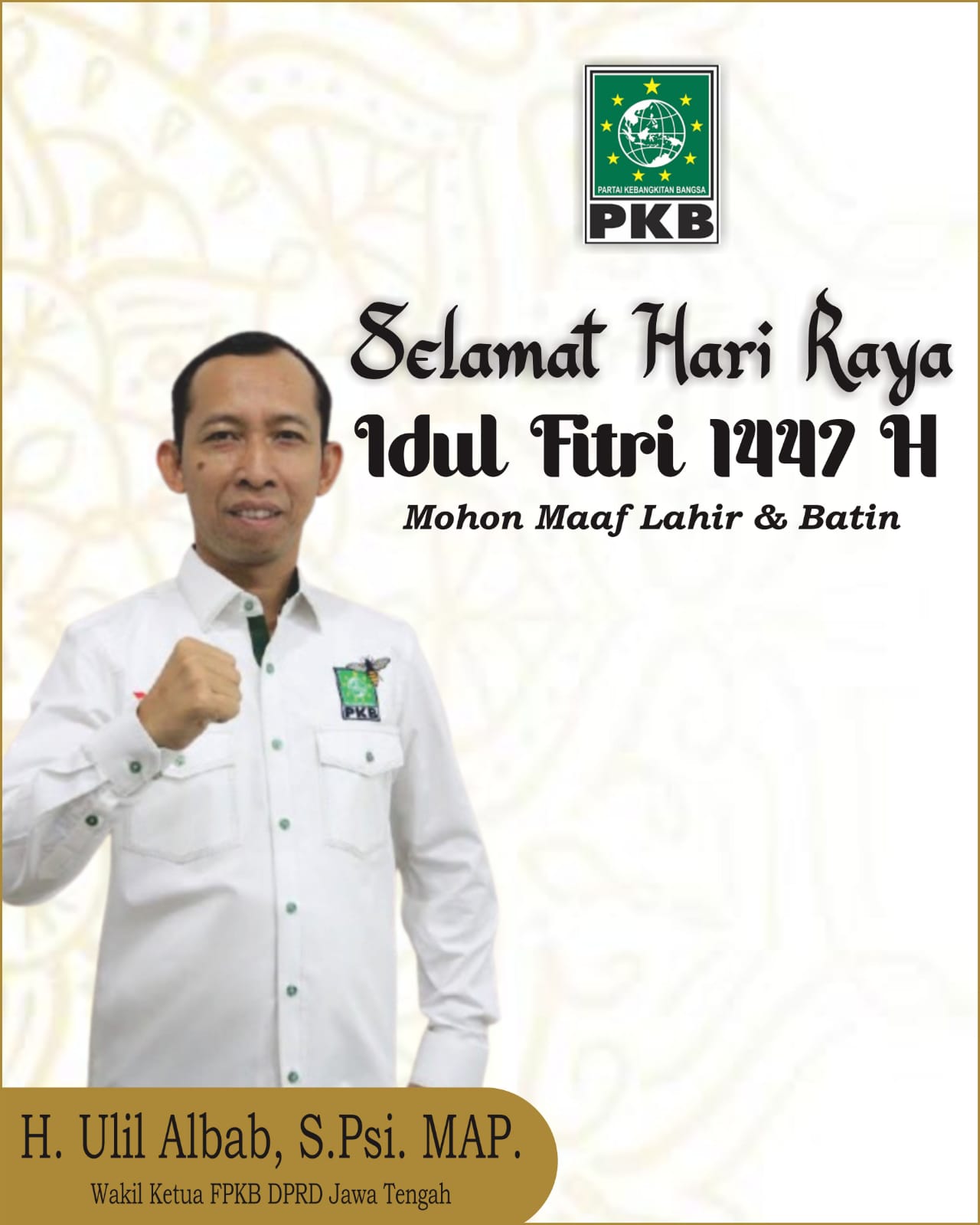 RegionalH. Ulil Albab, S.Psi, M.AP., Mengucapkan Selamat Hari Raya Idul Fitri 1447 H by Redaksi 17/03/2026 Redaksi 17/03/2026 4 views 4 Anggota DPRD Jateng FPKBMohon Maaf Lahir BantinUlil Albab 0 FacebookTwitterPinterestEmail Redaksi Following Author previous post BAZNAS Kabupaten Jepara Mengucapkan Selamat Hari Raya Idul Fitri 1447 H next post Zakat Fitrah : Pengertian, Niat dan Waktu Pembayarannya You may also like Tumpah Ruah, Ribuan Warga Saksikan Festival Thongtek Piala Bergilir Bupati Jepara 2026 14/03/2026 Lantik 57 Pejabat, Bupati Jepara Tekankan Pelayanan Publik Lebih Optimal 13/03/2026 Program Mudik Gratis Jateng Kembali Dibuka, Ini Jadwalnya 10/03/2026 JIF-BW 2026 Digelar, Teguhkan Jepara Sebagai Kota Ukir Dunia 08/03/2026 Curhatan Ozi, Pekerja Migran Penyintas Kanker Langka 04/03/2026 PKK Jepara Bergerak, dari Sedekah Sampah hingga Penguatan Literasi Anak 01/03/2026