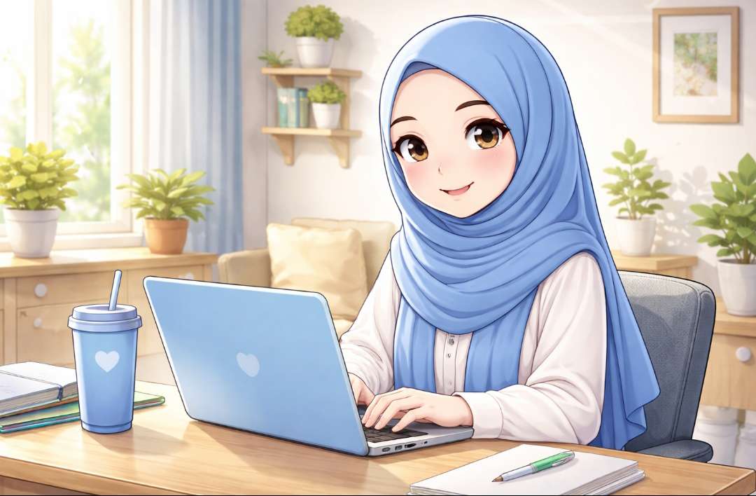 Di meja kerjanya ia banyak diam. Tatapan matanya sering kali di arahkan ke laptop birunya. Terkadang ia menulis, membaca e-book, atau berselancar di dunia maya. Jarang sekali ia membuka ponselnya, apalagi media sosial. Sesekali ia minum air mineral pakai tumbler birunya. Tak jarang ia mencoret buku catatannya dengan kalimat-kalimat sebagaimana yang ia pikirkan.