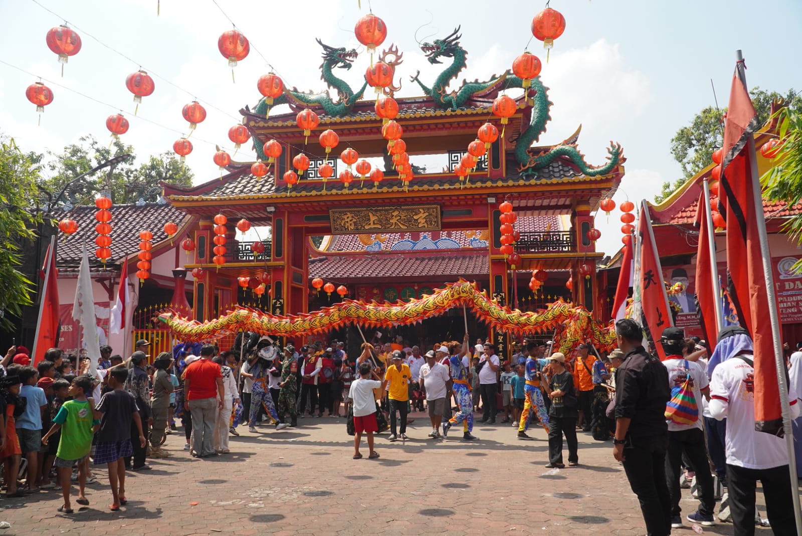 Kirab berlangsung semarak. Barongsai menari lincah mengikuti alunan musik tradisional, sementara tandu-tandu suci diarak penuh penghormatan.